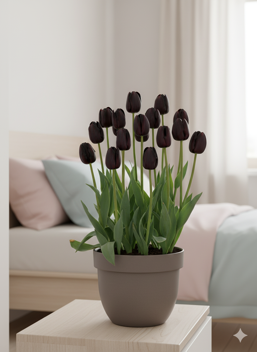 Глибокий, майже чорний відтінок пелюсток додає кімнаті нотку таємничості, розкоші й витонченості — саме тому Queen of Night обирають ті, хто хоче створити стильний і незабутній акцент у своєму просторі.